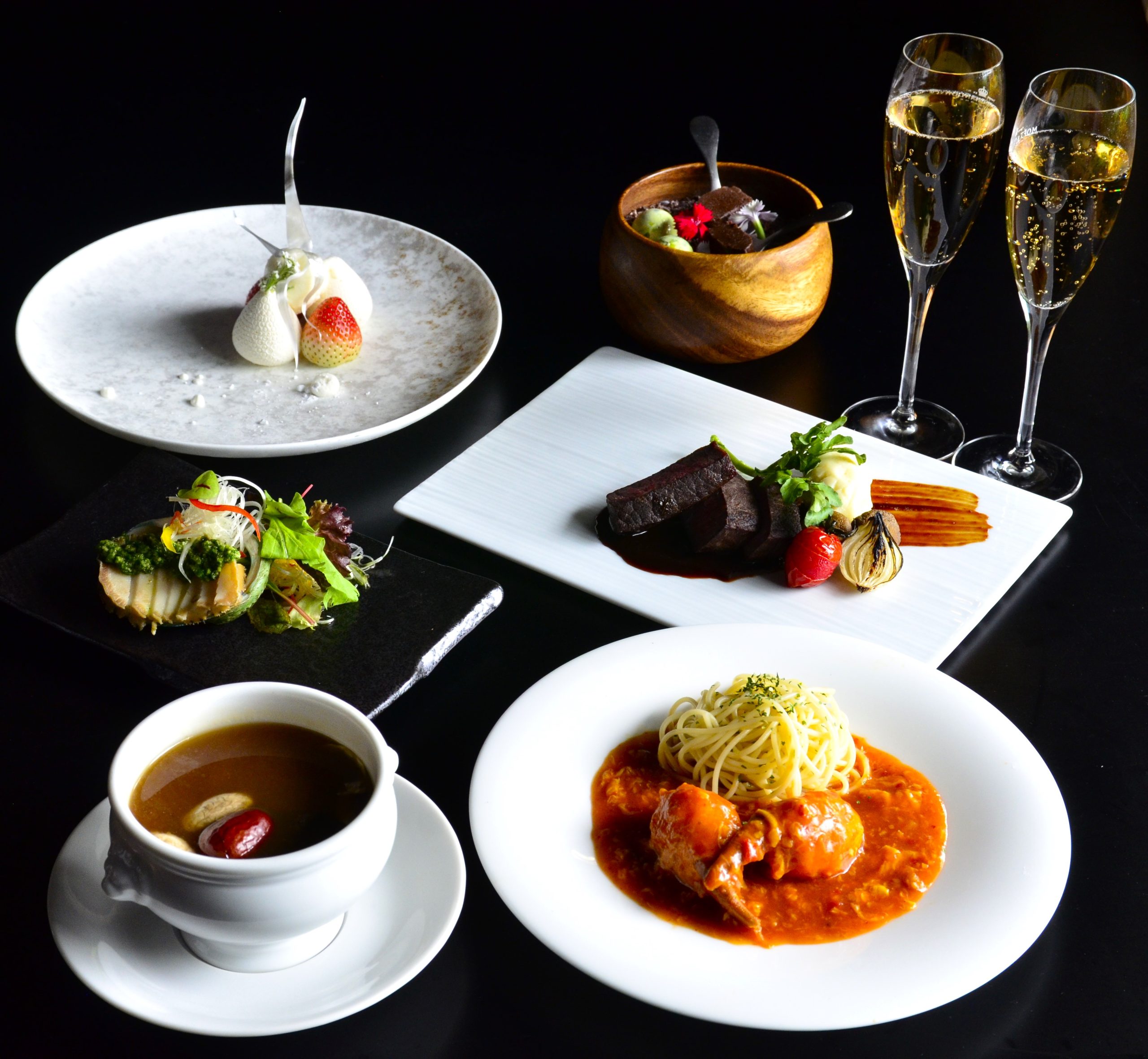 また、メインには「ずわい蟹爪のチリソース パスタを添えて」、デザートには「Xmasショートケーキ」と「ミニャルディーズ」で締めくくる特別な内容となっております。