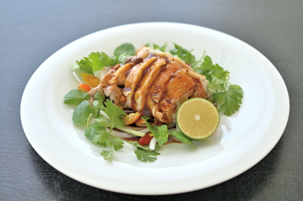 しっとり蒸し上げた鶏もも肉を、特製へべすソースとフレッシュハーブで。