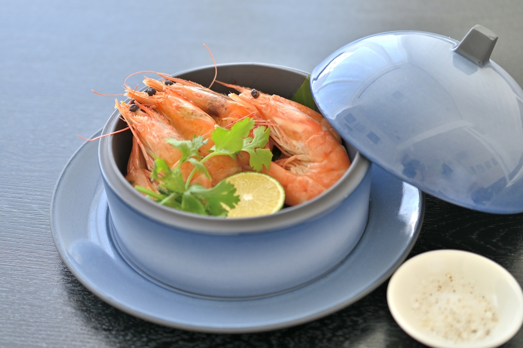 蒸し上げた海老を、自家製へべすソルトとフレッシュへべすでシンプルに。