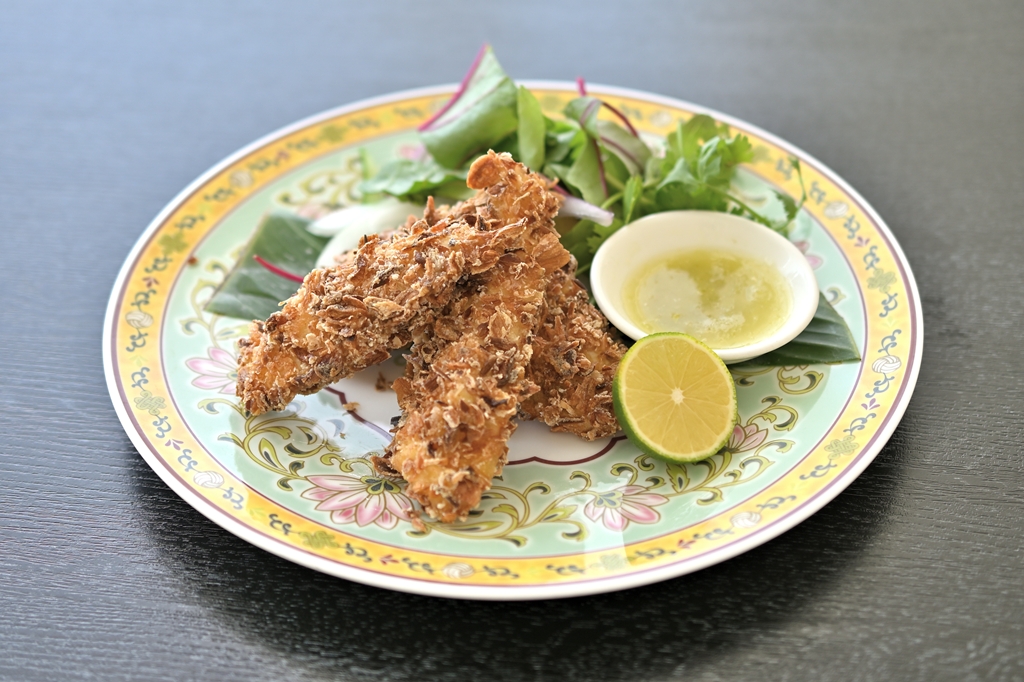 サクサクに揚げたチョウザメを、へべすと唐辛子のスパイシーサワーソースで。