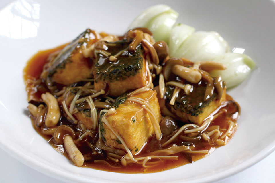 自家製の翡翠玉子豆腐は、ほうれん草をトッピングした豆腐という、この料理のためのスペシャルバージョン。カラリと揚がった豆腐にとろりとしたキノコあんかけが絡み、食感楽しい一皿です。