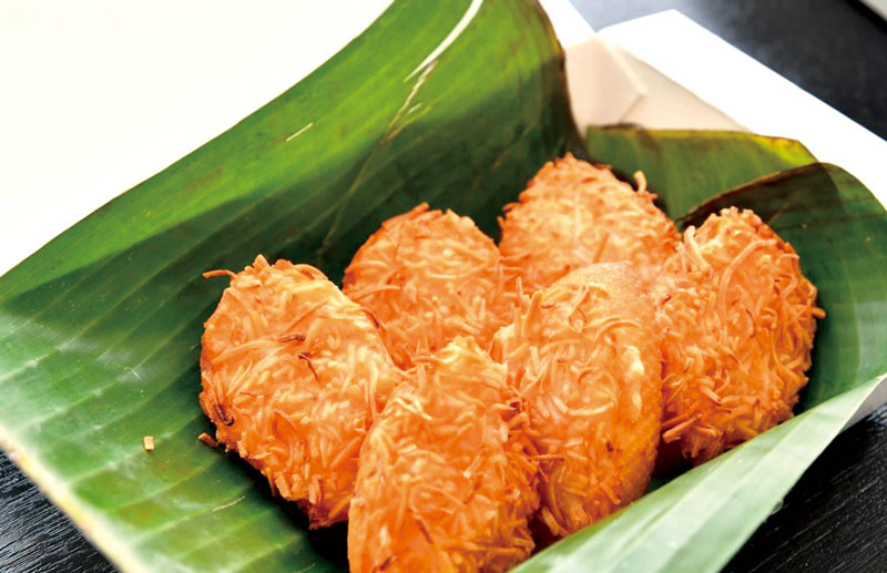 バケットに海老のすり身をのせてココナッツをまぶして揚げたサクサク触感の海老トースト