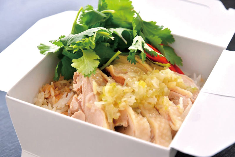 やわらかく蒸した鶏肉とチキンスープで炊いたパンダンのハーブが香るジャスミンライスのシンガポールチキンライス